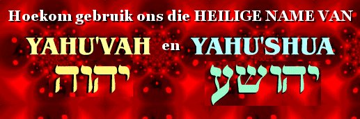 Julle sal oplet dat daar verskillende uitsprake vir die Hebreeuse Name van GOD en JESUS is.Maar ons Hemelse Vader het duidelik aan ons gesê, "dit maak nie saak hoe julle MY Namespel nie, solank die NAAM YAH daarin is." Die antichris gaan tydens die Groot Verdrukking,SY Seun se Naam Jesus gebruik wanneer hy aan bewind kom. Daar is groter salwingskrag in SY Ware Hebreeuse Name, gebruik dit. Ongelukkig is daar gelowe wat die Naam Jehovah gebruik en mense mislei. Moet ons asseblief nie verwarmet die Jehovah Getuies nie. |